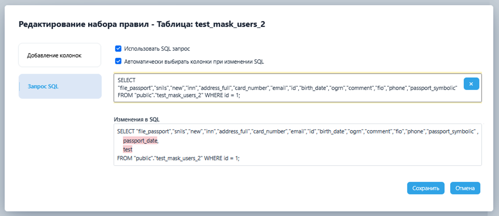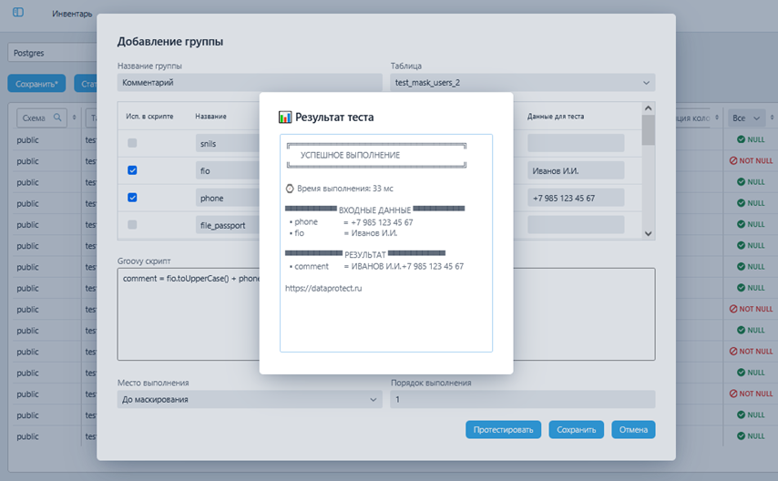 - Функционал SQL пред/пост обработки — для отключения/включения обвязки БД, а также выполнения пользовательских SQL скриптов, который генерирует SQL скрипты на основе структуры БД и выбранных алгоритмов маскирования, при этом давая возможность пользователю их редактировать, при необходимости;