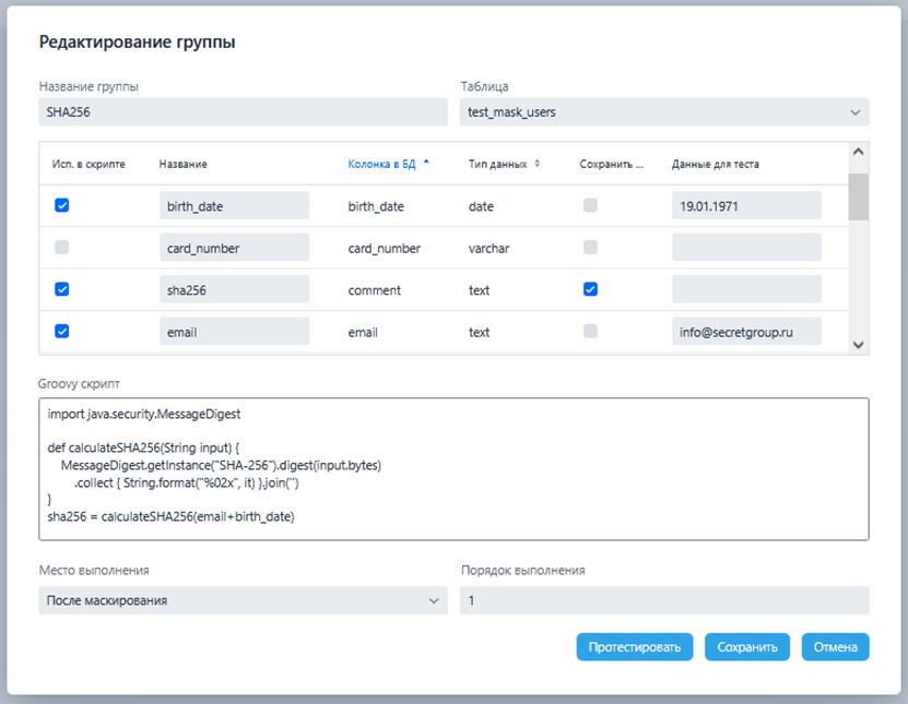 Предустановленные алгоритмы маскирования, их перечень описал в начале статьи. В том числе с возможностью написания сложных пользовательских алгоритмов (например, для пересчета SHA256 после маскирования), а также работы с нескольким колонками одновременно (без необходимости создания отдельных процессов для последовательных операций);