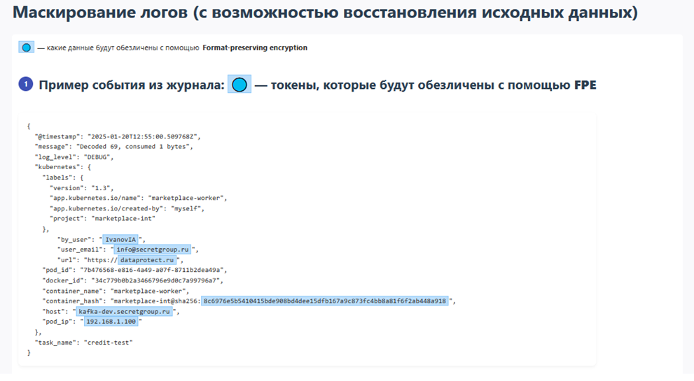 - Функционал маскирования логов с возможностью восстановления исходных данных;