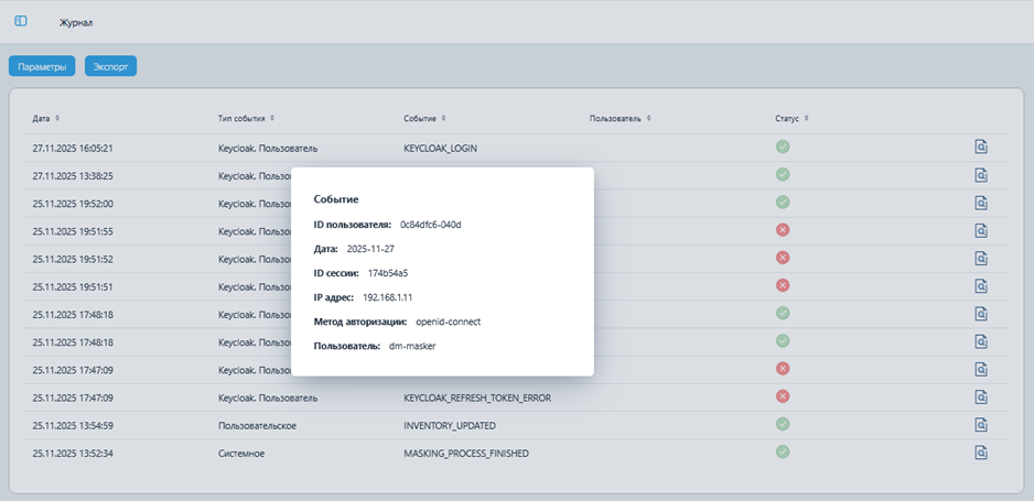 Журналирование — детальная фиксация всех авторизаций пользователей, запусков заданий маскирования и изменений конфигураций для обеспечения аудита и отслеживания процессов и изменений;