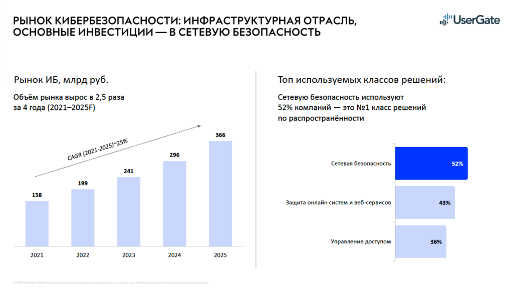 Главная цифра: за период с 2021 по 2025 год рынок ИБ вырос в 2,5 раза — со 158 до 366 млрд рублей, со средним темпом около 25% в год. Сетевая безопасность остаётся самым распространённым классом решений: её используют 52% компаний, и именно в этот сегмент входит NGFW. По словам Юлии Косовой, NGFW превратился из «коробки» в инфраструктурное ядро, которое крупный бизнес приобретает как элемент управления сложностью и рисками.