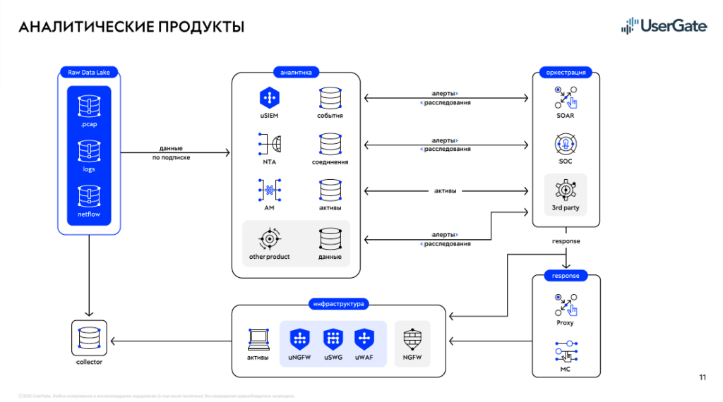 Ключевая концепция — Raw Data Lake: хранилище «сырых» данных, куда стекаются pcap-файлы, логи и netflow со всей инфраструктуры. Поверх этого озера работают аналитические модули: UserGate SIEM (uSIEM) для обработки событий, NTA для анализа сетевых соединений, AM для управления активами. Аналитические модули подключаются к Raw Data Lake по подписке, каждый потребляет только нужный ему срез данных. Оркестрация и реагирование замыкаются через SOAR и SOC с возможностью интеграции сторонних продуктов.