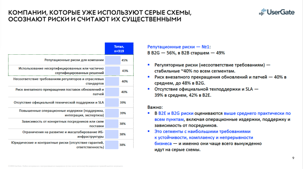 При этом серые схемы работы с ушедшими вендорами остаются массовым явлением. По данным Юлии Косовой, 74% компаний так или иначе используют решения иностранных производителей через неофициальные каналы. Из них 32% делают это ограниченно, для поддержки существующей инфраструктуры, 24% вынуждены из-за отсутствия сопоставимых альтернатив. Ещё 18% продолжают активно использовать иностранные решения и планируют сохранять эту практику. Полный отказ от серых схем остаётся редкостью: в среднем его придерживаются около 9% компаний. В сегменте крупнейших enterprise-компаний с выручкой от 40 млрд рублей (B2E) в выборке не зафиксировано организаций, полностью отказавшихся от подобных практик.