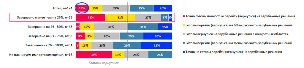 Показательна связь между глубиной импортозамещения и готовностью к возврату. Среди компаний, заместивших менее 25% решений, 60% готовы вернуться к зарубежным вендорам. Но чем дальше компания прошла по этому пути, тем меньше стимулов возвращаться на зарубежные СЗИ. Подробнее на картинке ниже.