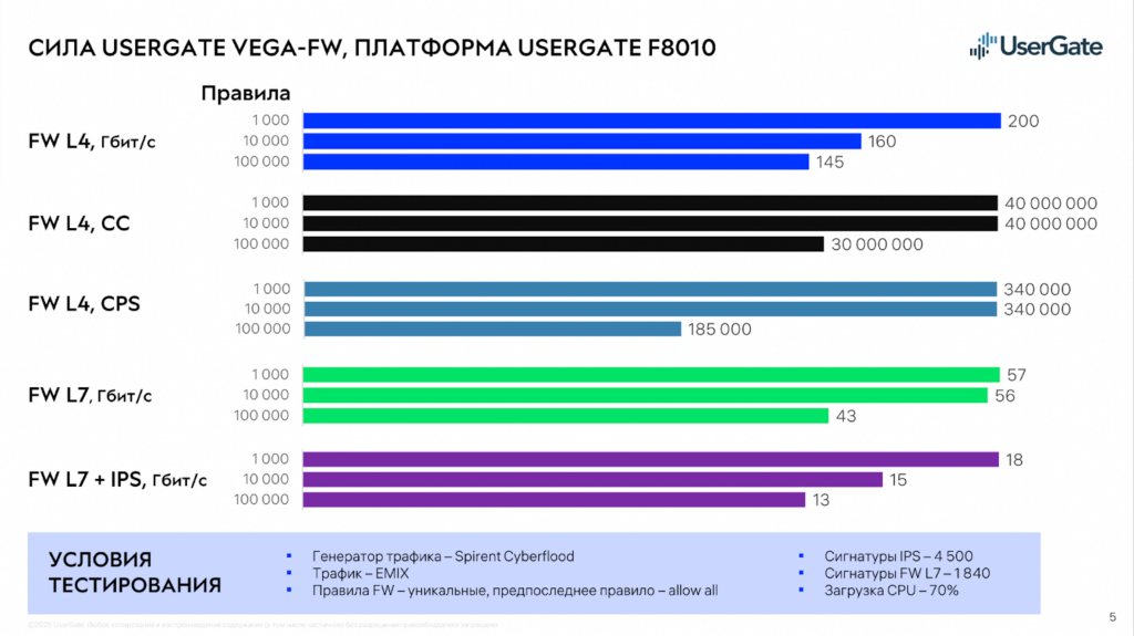 Основой UserGate DCFW стал собственный векторный межсетевой экран VEGA-FW (Vector Engine for Generic Access-control Firewall). На платформе F8010 он обрабатывает 130 000 правил FW L4 OSI, показывая 145 Гбит/с на трафике EMIX при 100 000 правил. Технология патентуется. По словам Кирилла Прямова, при увеличении числа правил на два порядка производительность падает менее чем на 28% — это принципиальное преимущество архитектуры. Результаты тестирования VEGA-FW представлены ниже.