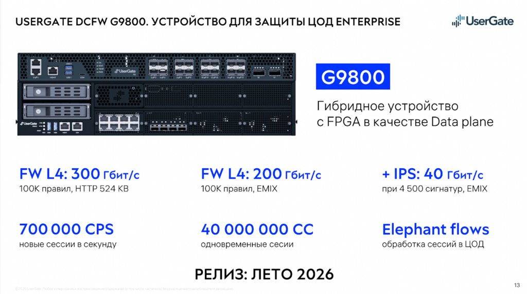 Также было представлено гибридное устройство для защиты ЦОД enterprise-заказчиков — UserGate DCFW G9800.