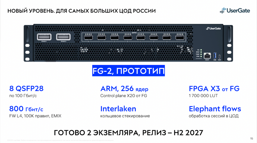 FG-2 оснащено 8 портами QSFP28 по 100 Гбит/с, ARM-процессором на 256 ядер и FPGA в три раза мощнее, чем в UserGate FG. Прогнозная производительность — 800 Гбит/с на FW L4 OSI при 100 000 правил на emix-трафике. Устройства поддерживают кольцевое стекирование через Interlaken: N устройств по 800 Гбит/с масштабируются линейно. Готово два экземпляра, релиз намечен на вторую половину 2027 года.