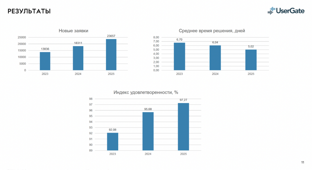 Результаты за три года выглядят парадоксально: число заявок выросло на 71% (с 13 836 в 2023 году до 23 657 в 2025-м) — следствие роста клиентской базы. При этом среднее время решения сократилось на 25% (с 6,7 до 5,02 дня), а индекс удовлетворённости поднялся с 92% до 97%.