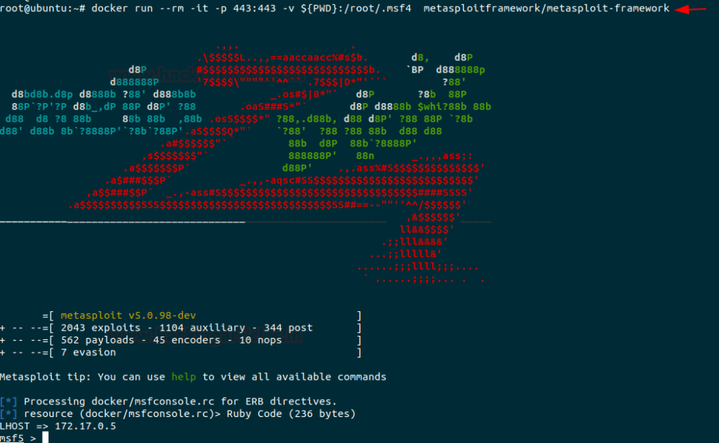 docker run --rm -it -p 443:443 -v ${PWD}:/root/.msf4 metasploitframework/metasploit-framework
