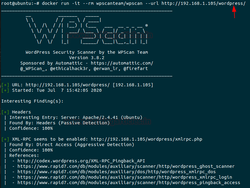 Для использования образа WPScan Docker пользователю просто нужно выполнить следующую команду и начать пентестинг его WordPress.