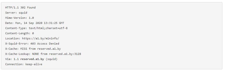 В А1 решили блокировать веб-сайты с использованием прозрачных прокси HTTP и HTTPS на основе Squid. Веб-прокси (reserved.a1.by) запускает ответ только для IP-адресов заблокированных веб-сайтов, за редирект также отвечал HTTP 302: