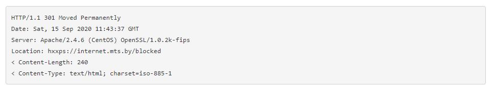 Оператор «Белтелеком» применял для блокировок разные сигнатуры. Http-трафик на порт 80 перенаправлялся на 82.209.230{.}23, за редирект отвечал http 302: