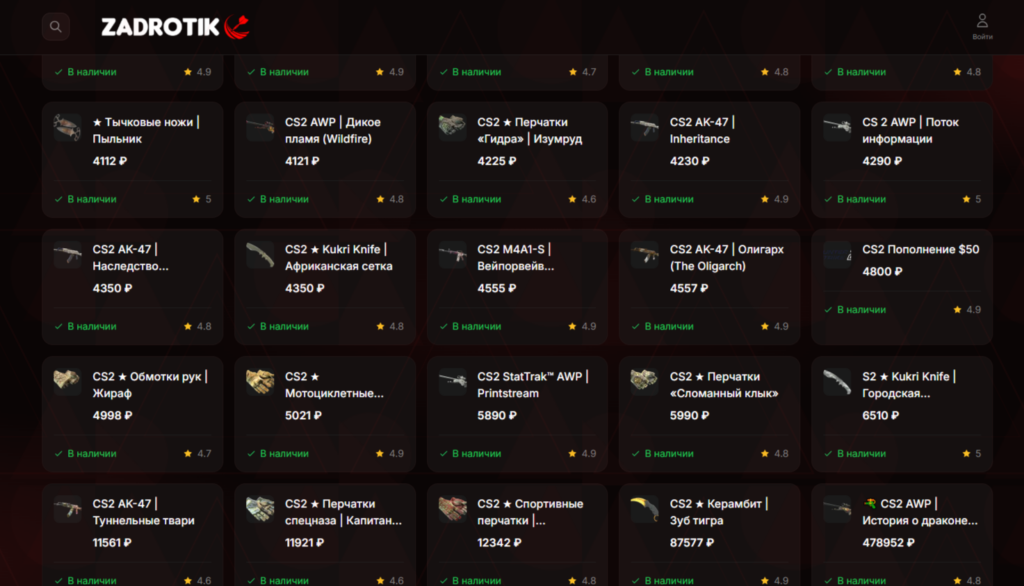 В списке предложений – цифровые товары для 39 мобильных и компьютерных игр. Среди них – CS2, Rust, Standoff 2, Fortnite, PUBG Mobile, Genshin Impact. Стоимость игровой валюты, лицензионных ключей и внутриигровых предметов – от 810 руб. до 478 тыс. руб (за скин для игры CS2 «Dragon Lore»).