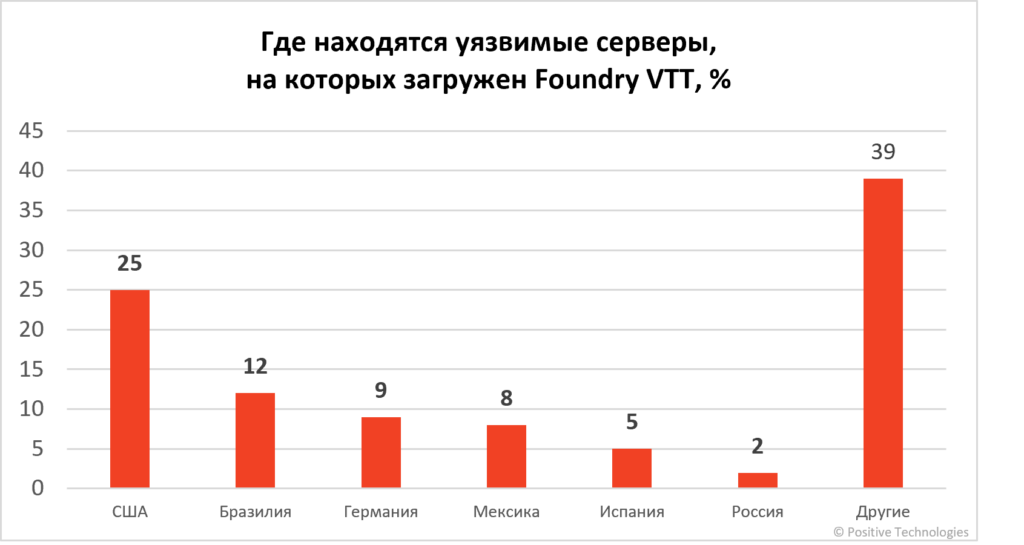 Foundry VTT пользуется популярностью среди онлайн-игроков. На официальном сервере платформы в Discord 104 тыс. участников и более 90 тематических игровых каналов. Ежемесячно к нему присоединяются около 1,5 тыс. пользователей. Сообщество платформы в Reddit посещают 50 тыс. игроков в неделю. В ходе мониторинга актуальных угроз (threat intelligence) эксперты Positive Technologies установили, что потенциально по всему миру уязвимы около 120 тыс. серверов. Наибольшее их число находится в США (25%), Бразилии (12%), Германии (9%), Мексике (8%), Испании (5%), а также в России (2%).