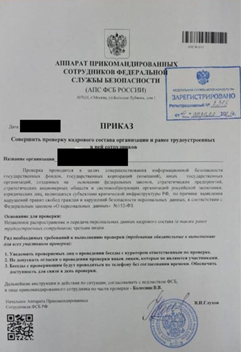В последнее время участились случаи мошеннических рассылок от имени Федеральной службы безопасности РФ. Такие письма приходят сотрудникам российских компаний на личную или корпоративную почту и содержат информацию о якобы проводимой проверке или расследовании в рамках уголовного дела. Внешне такие письма могут выглядеть убедительно, например: