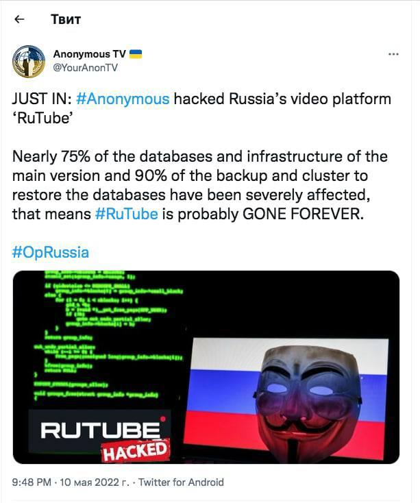 Хакерская группа Anonymous, которая в конце февраля на фоне проведения военной спецоперации на Украине объявила «кибервойну» Российской Федерации, заявила в своём Twitter-аккаунте, что ответственность за проведение масштабной кибератаки на Rutube лежит на ней.