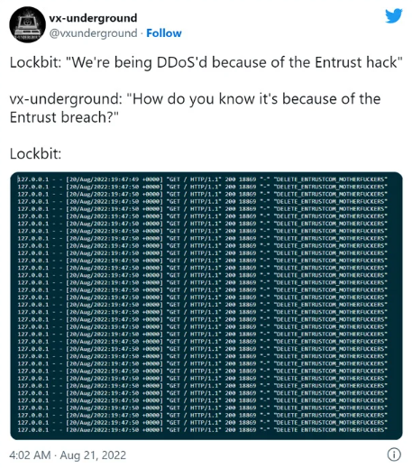 21 августа исследовательская команда VX-Underground узнала от представителей LockBit, что сайты группировки в Tor подверглись DDoS-атаке со стороны «того, кто, вероятно, связан с компанией Entrust».
