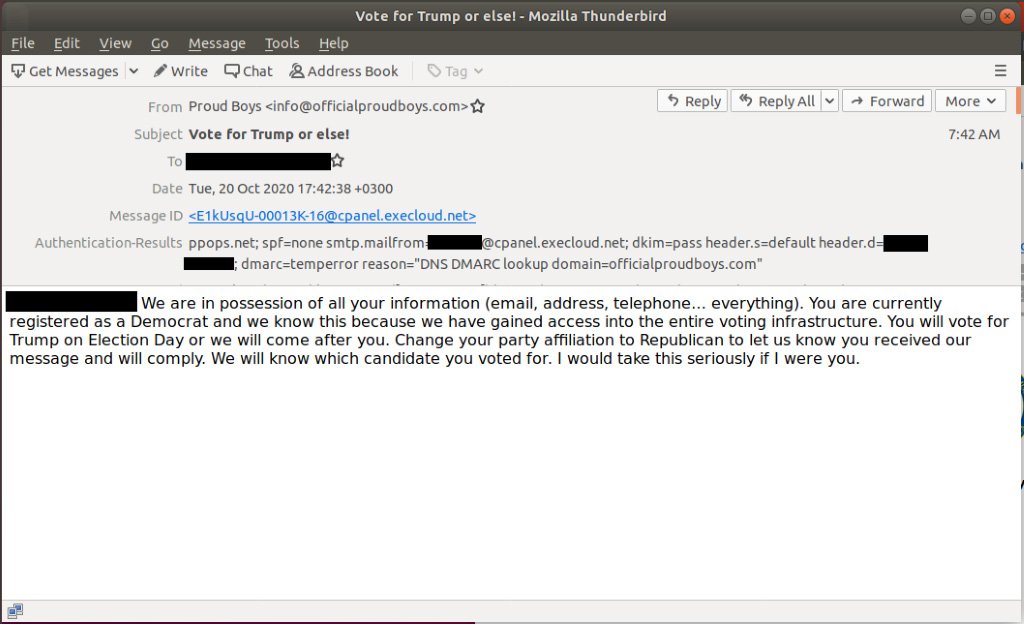 В рассылаемых email-письмах используется тема «Голосуйте за Трампа» или что-то подобное. В тексте письма демократов склоняют к тому, чтобы они «сменили свою партию на республиканскую и проголосовали на выборах за Трампа, иначе Proud Boys придут за ними».