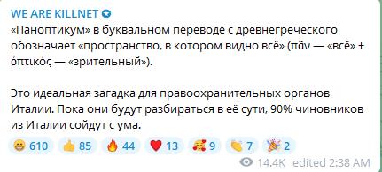 При этом в новом сообщении Killnet в Telegram-были озвучены угрозы именно против Италии. В нём говорится, что из-за предстоящих атак 90% итальянских чиновников сойдут с ума.