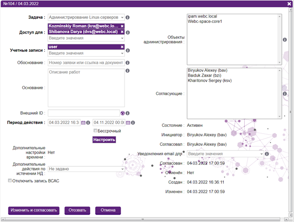 Рисунок 3. Пример реализации модели «just in time» и ZSP в sPACE PAM. Форма запроса наряда-допуска — разрешения на доступ к конкретному ресурсу для решения конкретной задачи определенному пользователю с заданными привилегиями на конкретный период