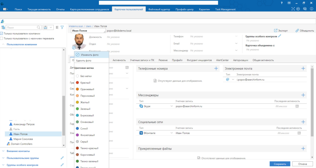 После установки ИИ-модуля нужно добавить изображения сотрудников в Карточки пользователей. Для этого нужно перейти в соответствующую вкладку в Консоли аналитика и выбрать «Добавить фото» в меню опций. Если в Active Directory уже есть фототека сотрудников, КИБ «подтянет» ее автоматически, распределив изображения по Карточкам в соответствии с профилями AD.
