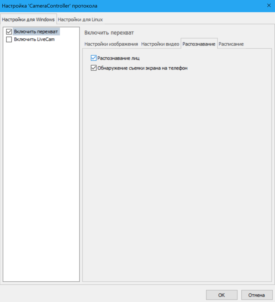 Для этого перейдите в настройки модуля СameraСontroller, зайдите во вкладку «Распознавание» и проставьте галочки напротив пунктов «Распознавание лиц» и «Обнаружение съемки экрана на телефон».