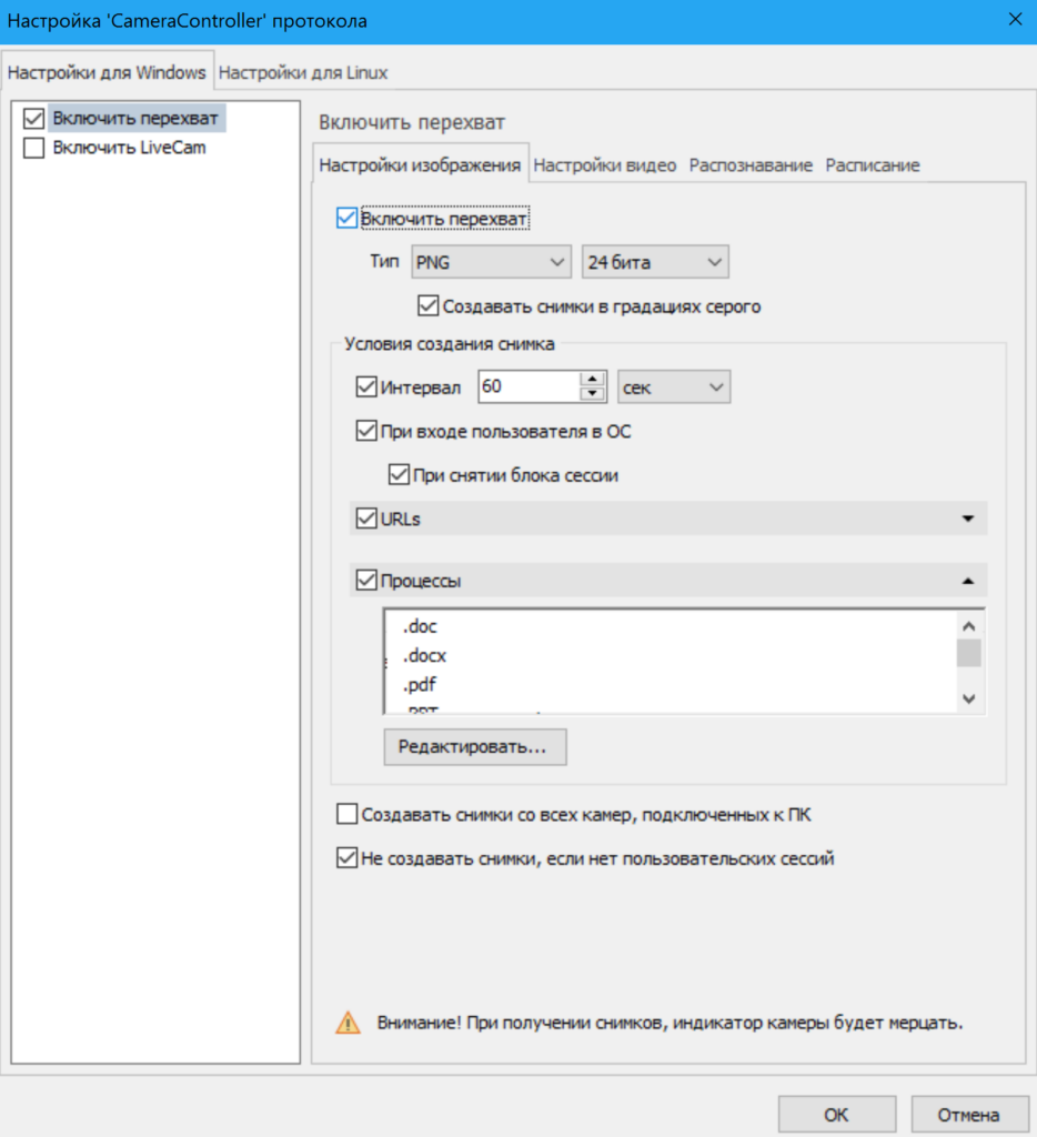 - Для распознавания телефонов нужно выбрать процессы и сайты, запуск которых будет активировать камеру и/или выставить расписание съемки с нужным интервалом.