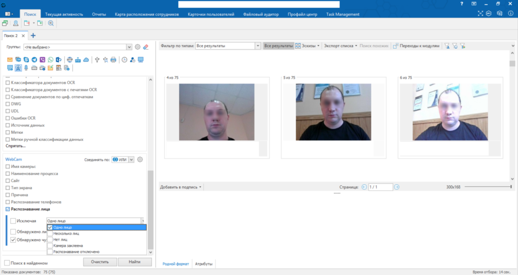 - При распознавании лиц КИБ сравнивает две фотографии. Первая – эталон из Карточки пользователя или профиля сотрудника в Active Directory. Вторая – с веб-камеры, которая снимает пользователя на ПК. Система сравнит два снимка и, если обнаружит несовпадения, зафиксирует инцидент.