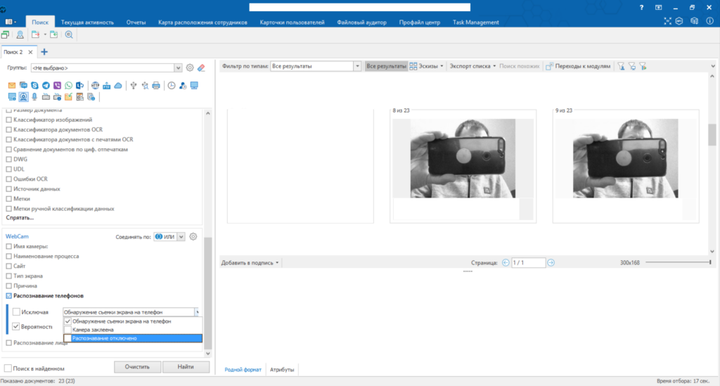 - При распознавании телефонов система делает фотографии по заданным параметрам и анализирует их. Если система обнаружит объекты, похожие на смартфоны, то ИБ-специалист получит соответствующее уведомление. Степень схожести система определяет благодаря обученной нейросети «под капотом»: она достоверно отличает смартфон от внешних жестких дисков (соответствие по размеру, форме) и других предметов. При этом именно смартфоны, даже замаскированные или спрятанные, определяются с высокой точностью. Распознавание работает вне зависимости от цвета, размера, модели, производителя устройства.