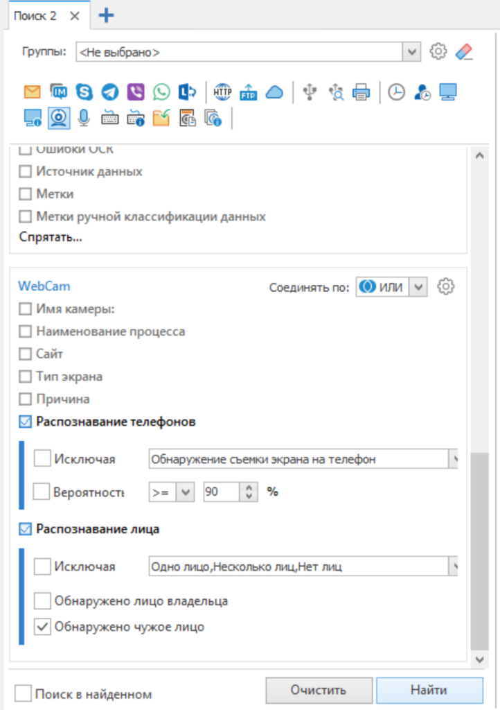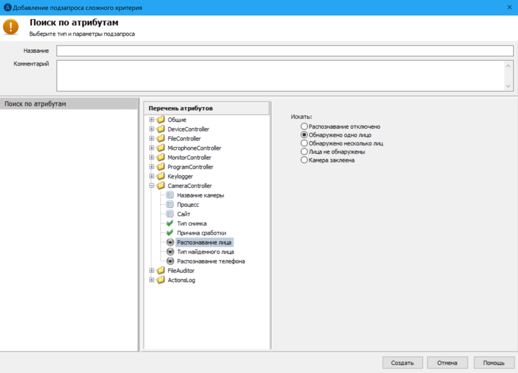 - в перечне атрибутов указываем нужные параметры поиска, например, «Распознавание лиц», и точное условие (перечень см. выше – он аналогичен условиям в Консоли аналитика).