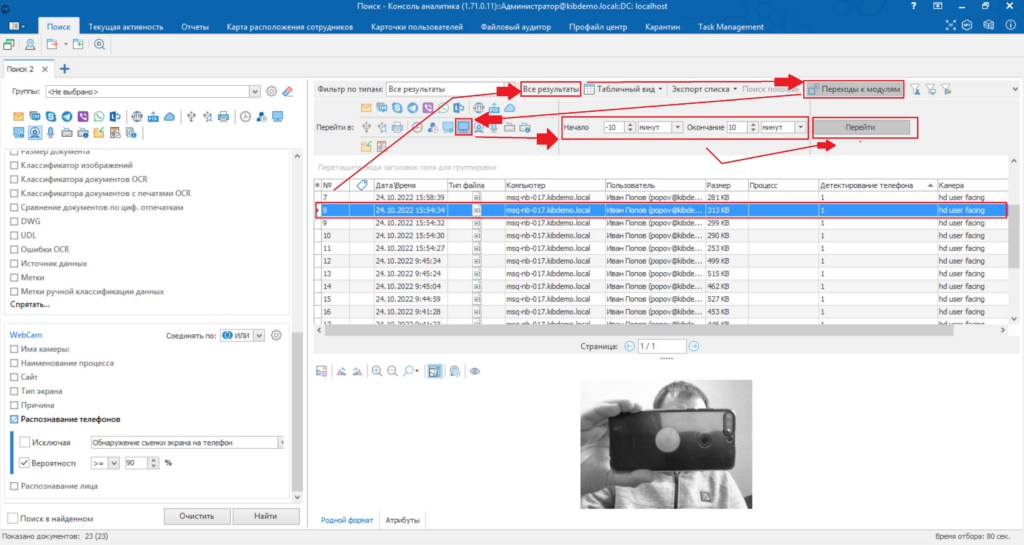 Найти тех, кто сидит под чужими учетками или фотографирует экран – это только полдела. Теперь важно узнать, что именно возможный нарушитель делал за чужим ПК или с телефоном в руках. Для этого нужно сопоставить дату и время инцидента с информацией из других модулей. Действенный способ – это использовать модуль MonitorController, он показывает, что происходит на экране пользователя в тот или иной момент.