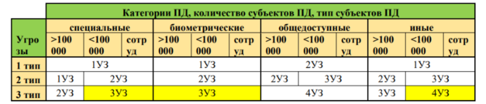 - для общедоступных ПДн при угрозах 3‑го типа возможен «4 УЗ» при больших объемах, поскольку риски НДВ не подтверждены.