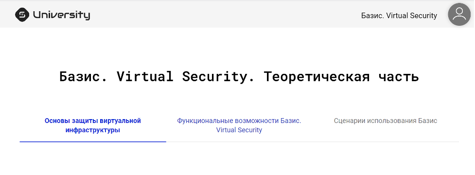 Сам курс делится на 3 урока, в которых даются теоретические знания. В первой части курса подробно разбираются основы защиты виртуальной инфраструктуры. Вас знакомят с технологией виртуализации и моделями потребления ее услуг, а также с основами идентификации и аутентификации пользователей в информационных системах. Во втором уроке изучается функциональные возможности Базис.Virtual Security, в третьем – типовые сценарии его использования.