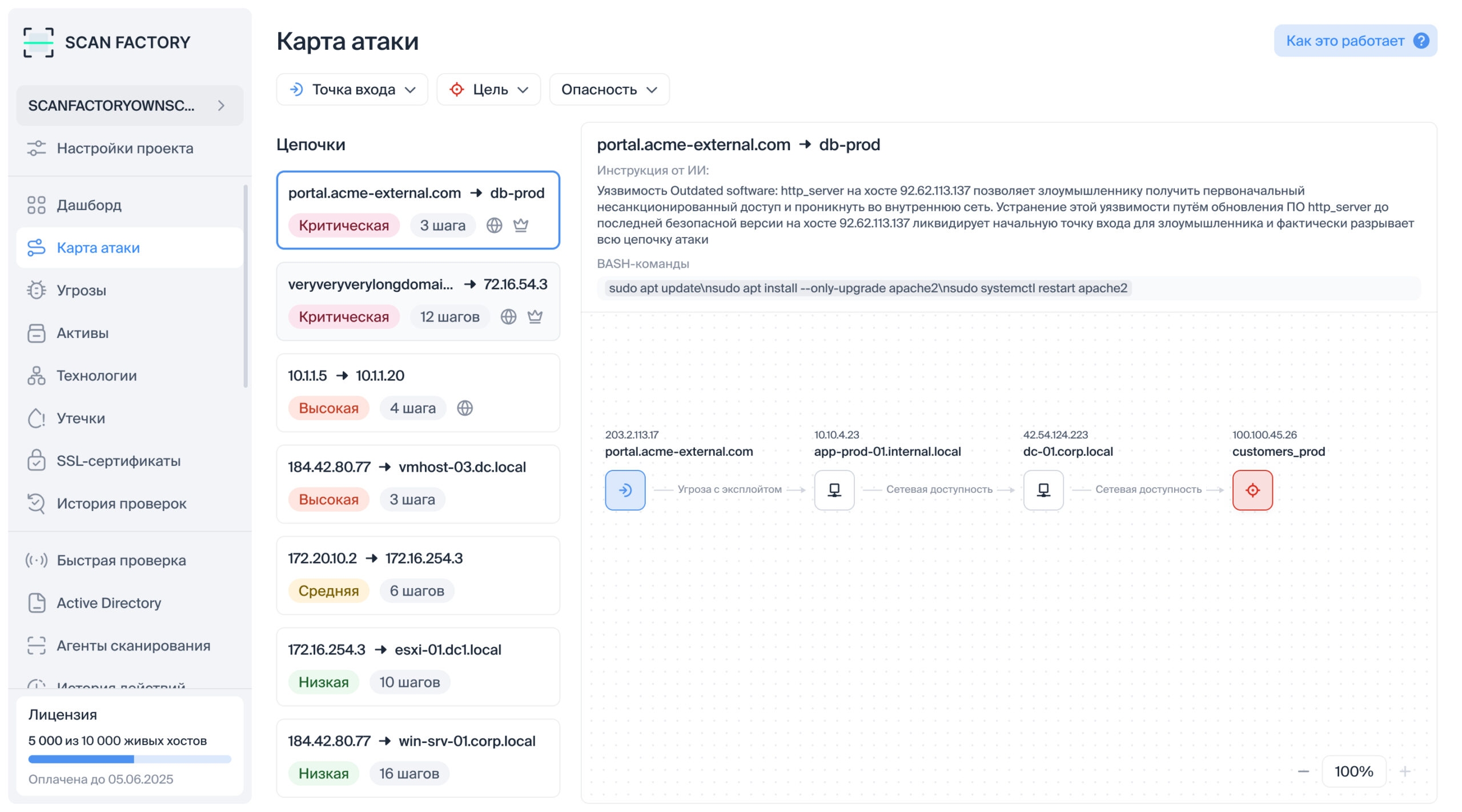 5. Система приоритизирует найденные цепочки, и отображает их в интерфейсе. Опасность цепочки определяется по Точке входа, Ценности цели и Дальности пути