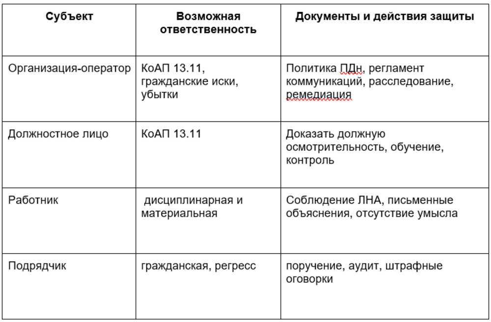 Оператор отвечает и за собственные ошибки, и за действия сотрудников и подрядчиков. Чтобы не подставляться, нужно зафиксировать запреты и допустимые каналы в ЛНА и договорах, внедрить технические барьеры для утечек, регулярно обучать сотрудников и быстро реагировать на инциденты с документальной фиксацией.
