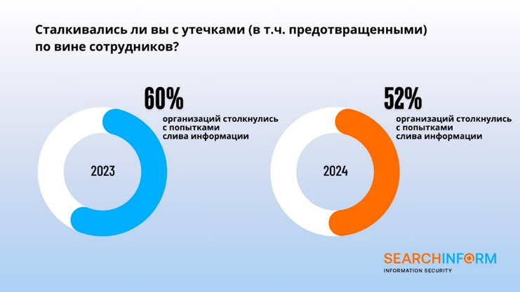 Так, по данным исследования, 52% промышленных организаций столкнулись с утечками информации по вине сотрудников в 2024 году, это на 8% меньше, чем годом ранее. При этом все еще велик риск случайных инцидентов: в 62% случаев сотрудники допускали утечку из-за ошибок и незнания базовых правил кибергигиены.