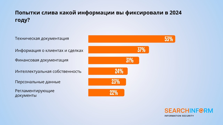 Промышленные организации оперируют большим количеством чувствительной информации: техническая и тендерная документация, ноу-хау разработки, результаты исследований, бизнес-планы, финансовые документы, сведения о клиентах и партнерах. Эксперты «СёрчИнформ» выяснили, какие данные чаще всего подвергались утечке. В 2024 году чаще всего промышленные организации сталкивались со сливами технических данных (53%) и информации о клиентах и сделках (37%). С попытками слива финансовой документации и персональных данных столкнулись в 31% и 23% промышленных организаций.*