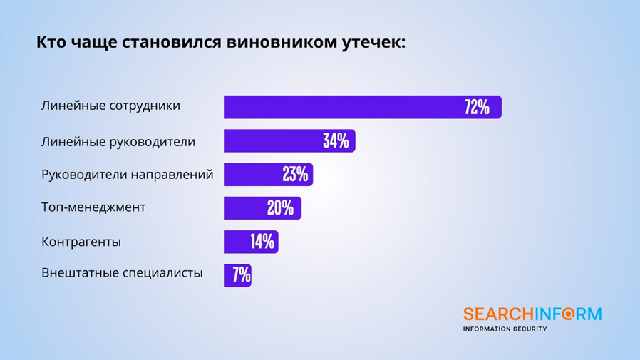 В 72% организаций виновниками утечек становились линейные сотрудники, реже –линейные руководители (34%). В 23% компаний сталкивались с инсайдерами среди руководителей направлений. Не редко виновниками инцидентов оказывались контрагенты компаний.*