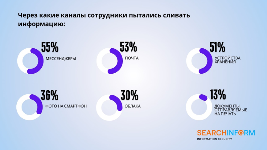 Также эксперты выяснили, через какие каналы происходили утечки. Большинство утечек в промышленных организациях происходит через мессенджер и почту. Однако 36% опрошенных сообщили о том, что сотрудники крадут данные, фотографируя их на телефон. До сих пор фото на смартфон остается одним из самых сложно контролируемых «каналов» утечки.