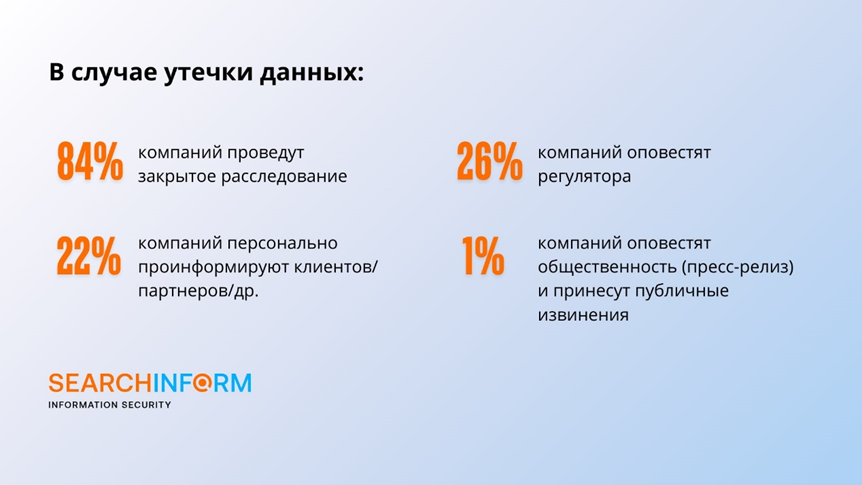 Также эксперты «СёрчИнформ» выяснили, как планируют действовать компании в случае утечек информации: в 2024 году большинство (84%) ответили, что проведут закрытое расследование. Оповестить регулятора планировали лишь 26% опрошенных. В 2025 году в случае утечки к отчету перед регулятором должны быть готовы 100% компаний операторов персональных данных.*