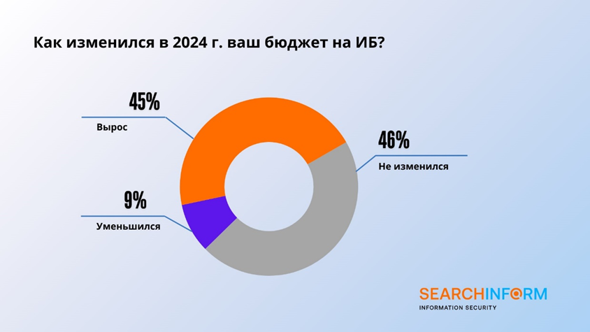В 2024 году в промышленном секторе охотнее выделяли средства на ИБ. Так 45% промышленных организаций увеличили бюджеты на информационную безопасность, 46% оставили бюджет без изменений, лишь 9% сократили финансирование.