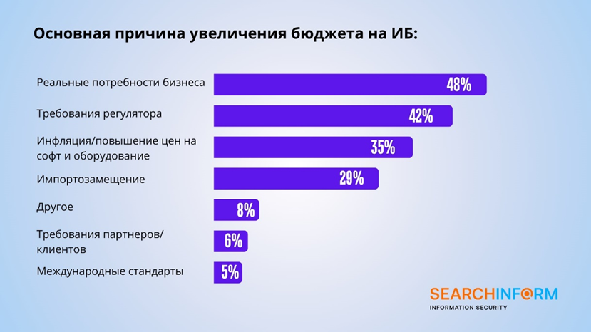 Основная причина, по которой организации увеличивали бюджеты на информационную безопасность – реальные потребности бизнеса, так ответили 48% опрошенных. 42% финансировали ИБ, чтобы выполнить требования регуляторов.*