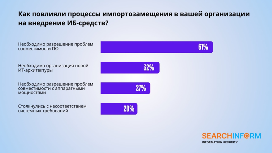 Основной трудностью импортозамещения, по оценке участников исследования, остаются проблемы совместимости решений с текущим софтом и оборудованием и необходимость организации новой ИТ-архитектуры.