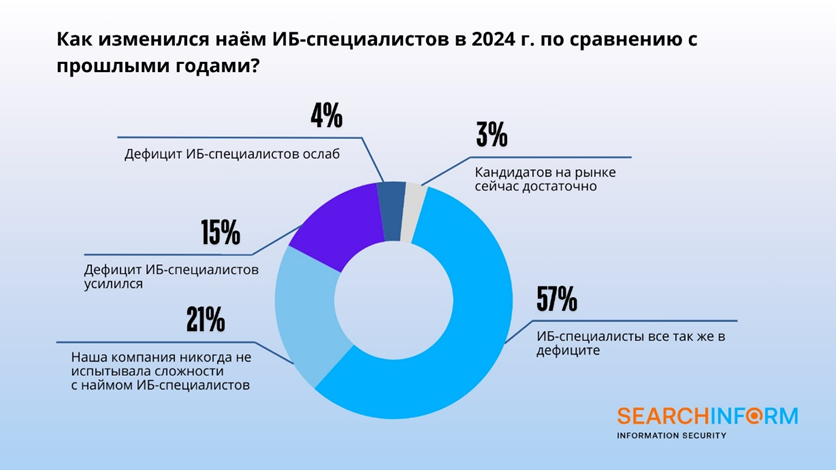 В промышленности дефицит кадров в области информационной безопасности продолжает расти, об этом заявили 15% опрошенных. В разной степени дефицит кадров ощущают 76% опрошенных. Лишь 3% считают, что специалистов на рынке достаточно, 21% не испытывают сложностей с наймом ИБ-кадров.