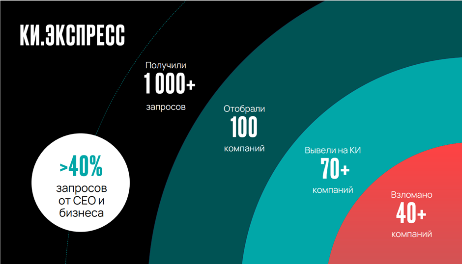 Напомним, в рамках программы «Кибериспытание Экспресс» 100 компаний получили грантовую поддержку и возможность оценить свою ИБ защищенность в реальных деньгах. 70 из них уже прошли через Кибериспытание. Каждая из компаний выбирала одно из типовых недопустимых событий, за демонстрацию реализации которого этичные хакеры могли получить награждение в 1 миллион рублей.