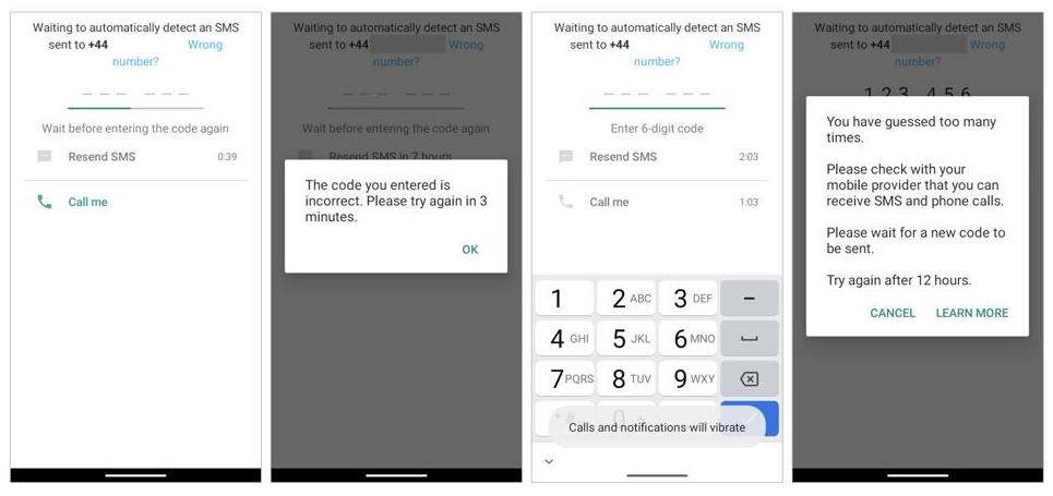 Мессенджер WhatsApp программно ограничивает число попыток ввода кода подтверждения. Поэтому, сразу после того, как лимит будет достигнут, на устройстве киберпреступника появится уведомление, что новую попытку можно будет предпринять только через 12 часов: