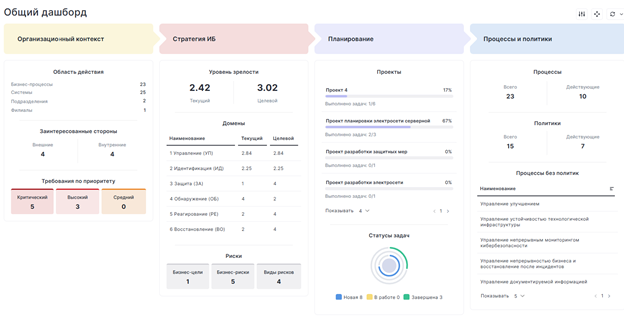 На базе выбранного фреймворка проводится анализ текущего и целевого состояния информационной безопасности в организации, на основе которого формируется стратегический план дальнейших мероприятий. Стратегический план может быть гибко разбит на этапы в зависимости от временных рамок, и на каждом этапе создаются задачи для конкретного исполнителя. Прогресс выполнения задач и проектов удобно отслеживать на сводном дашборде.