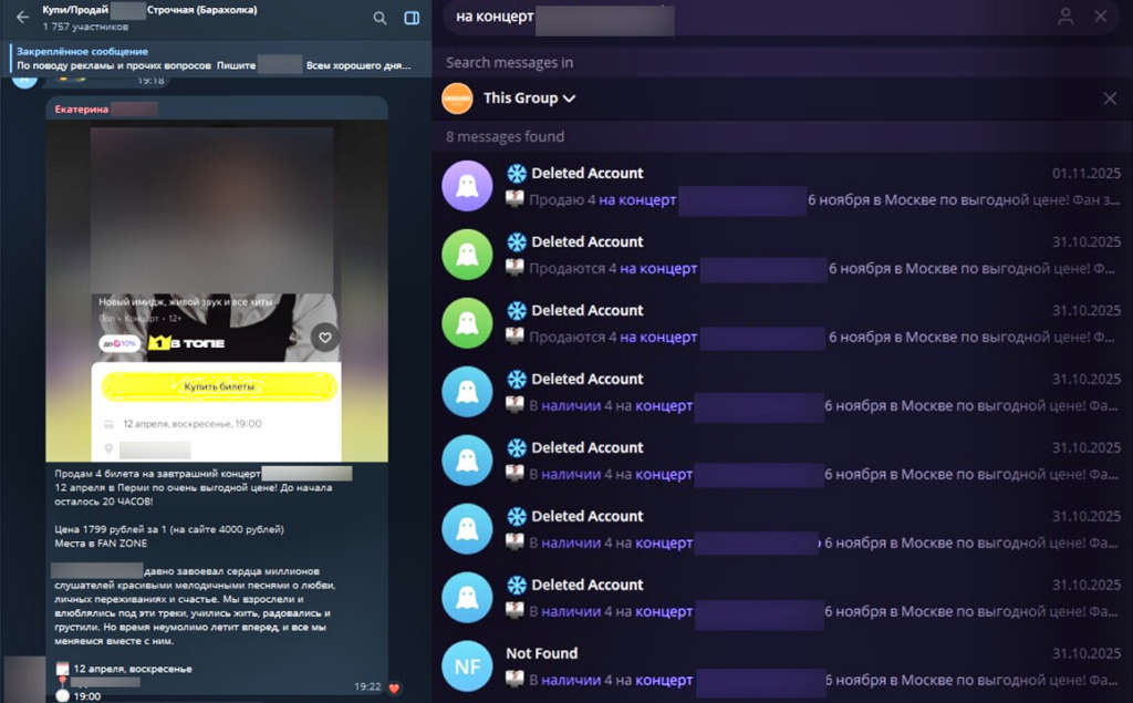 Если ранее основной площадкой для продажи поддельных билетов были сайты-двойники популярных сервисов и фишинговые страницы, то в последние месяцы киберпреступники всё чаще обманывают пользователей через объявления в мессенджерах и социальных сетях. Когда приманкой служат концерты в России, такие объявления размещают за 1-5 дней, а порой и за несколько часов до ожидаемого события.